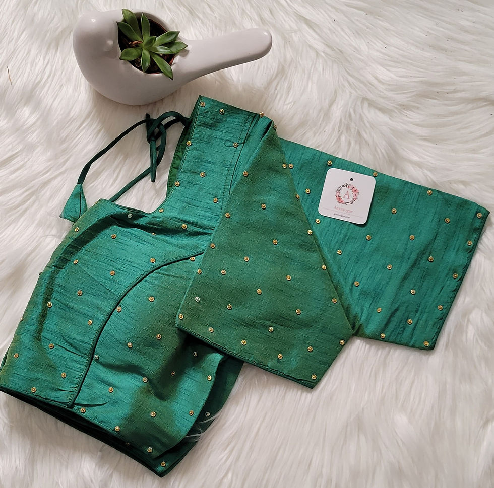 Rama Green raw silk with Golden butta readymade blouse for Indian saree