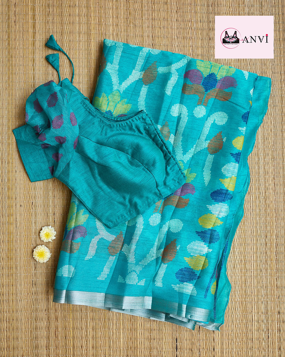 Powder Blue bishinpur silk saree with ready to wear blouse